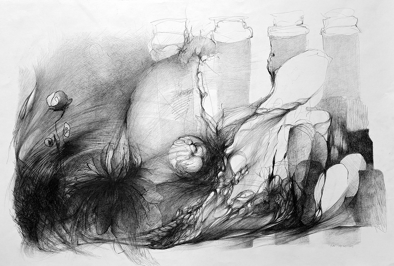 Teoskuva yllä: Nina Granlund, Pako, 69×100 cm, lyijykynä paperille, 2021-2023